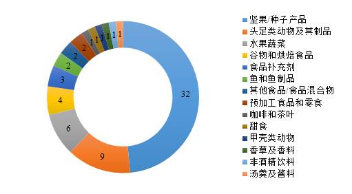 在被通報(bào)的農(nóng)食產(chǎn)品中,被通報(bào)最多的依然是堅(jiān)果/種子產(chǎn)品,占被通報(bào)的中國產(chǎn)食品總數(shù)的48.48%,其次為頭足類動(dòng)物及其制品、水果蔬菜。(詳見表4、圖3)