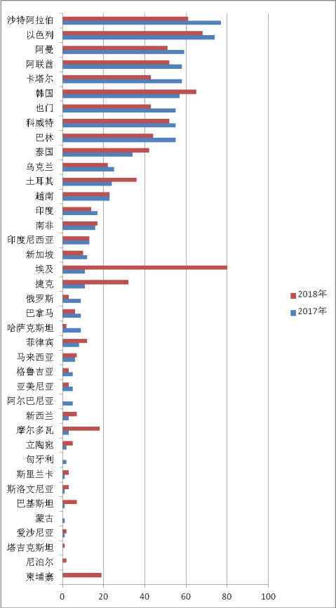 圖1 2017年和2018年一帶一路國(guó)家通報(bào)數(shù)比對(duì)
