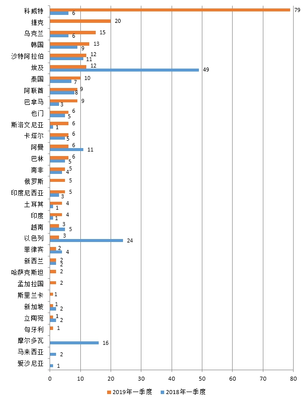 圖1 2018年和2019年一季度一帶一路國家通報數(shù)比對
