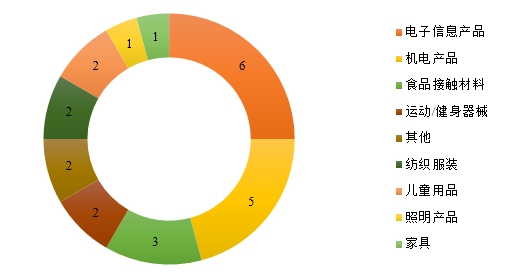 2019年一季度,美國消費者安全委員會(CPSC)共發(fā)布39例召回通報(Recall),期間適逢美國政府停擺,通報數(shù)大幅下降,同比減少45.8%。其中來自中國的產(chǎn)品(消費品)共24例,同比減少48.9%,占同期CPSC召回總數(shù)的61.5%,比重較去年同期減少3.7個百分點,涉及在美國和加拿大境內(nèi)銷售的產(chǎn)品約138.6萬件,涉及金額約8072.5萬美元。召回最多的是電子信息產(chǎn)品(詳見表2、圖2)。