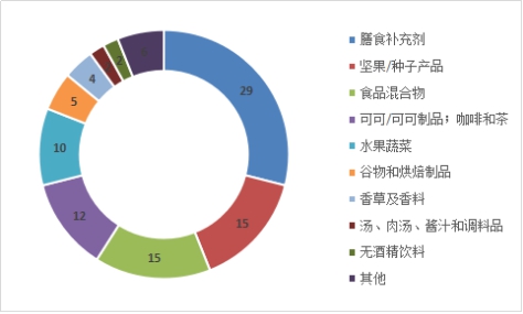 在被通報的農(nóng)食產(chǎn)品中,最多的是膳食補充劑類產(chǎn)品,占被通報的中國產(chǎn)食品總數(shù)的29.0%,其他被通報較多的產(chǎn)品還有堅果/種子產(chǎn)品、食品混合物和可可制品及咖啡和茶等(詳見表6、圖5)。