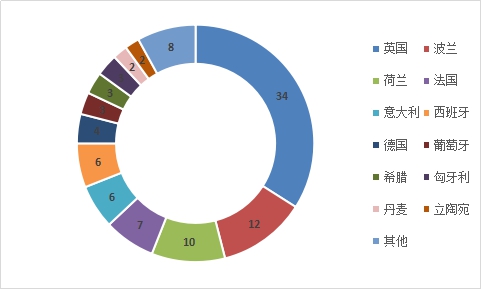 在通報國家方面,通報中國產(chǎn)食品最多的是英國,共通報34例,占中國產(chǎn)食品被通報總數(shù)的34.0%。其次為波蘭和荷蘭(詳見表7,圖6)。