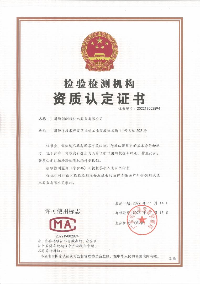CMA | 202219002894 | 在網(wǎng)頁的“認(rèn)證機構(gòu)名錄”板塊查找“廣州衡創(chuàng)測試技術(shù)服務(wù)有限公司”便可查看資質(zhì) | ||